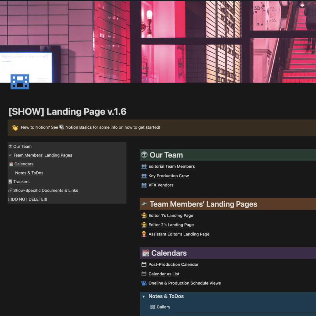 This Notion template centralizes key resources you’ll need to manage your editorial department and workflows, and collaborate with your team. Keep track of team members and vendors, track scenes, episodes, outputs, VFX, and more.